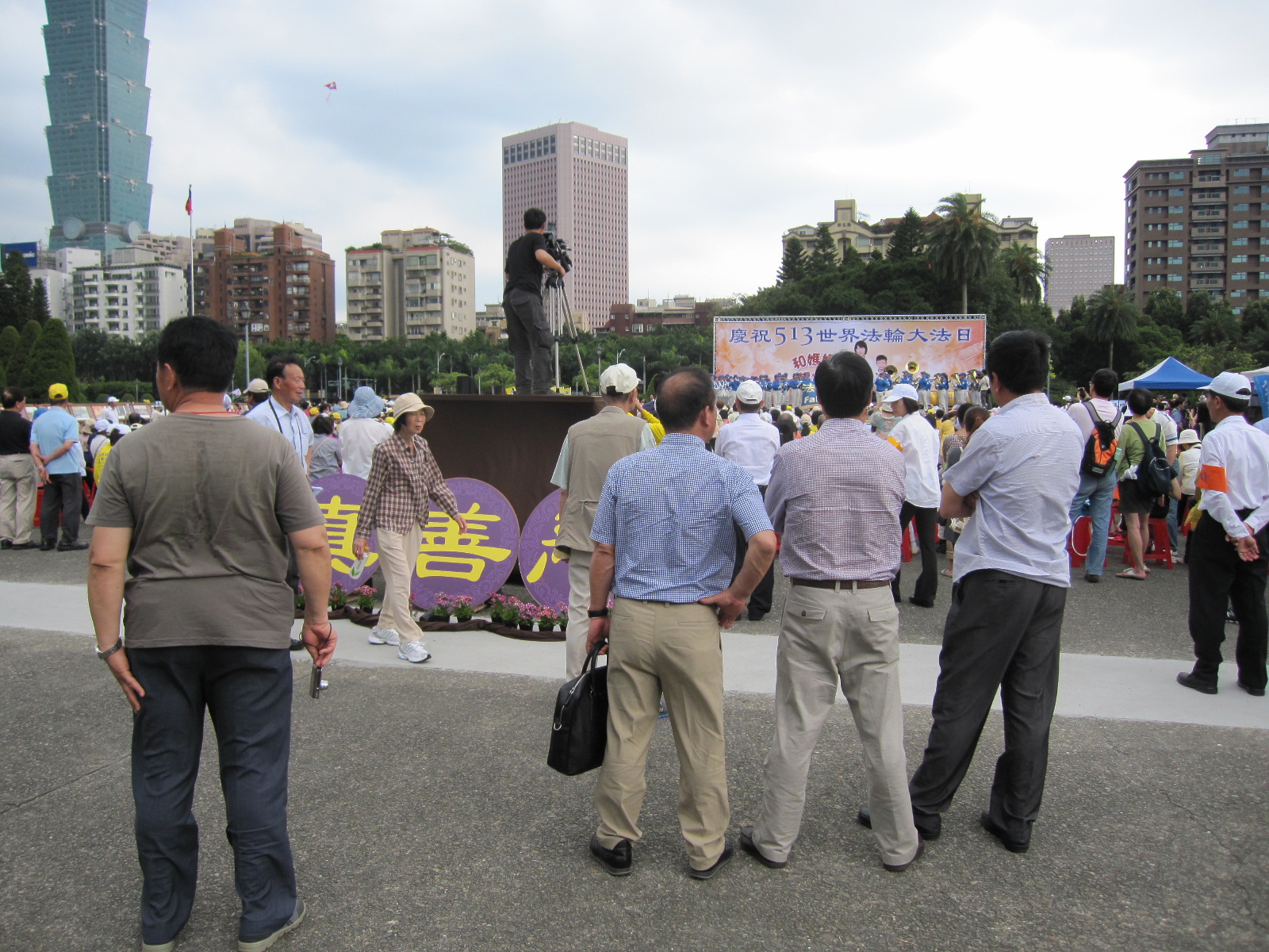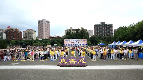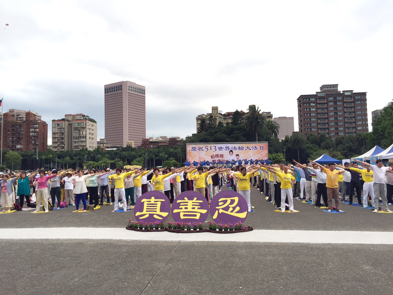 图1-3:台北千名法轮大法学员,五月三日在国父纪念馆前广场举办“庆祝五一三世界法轮大法日”活动,法轮功学员进行功法表演。
