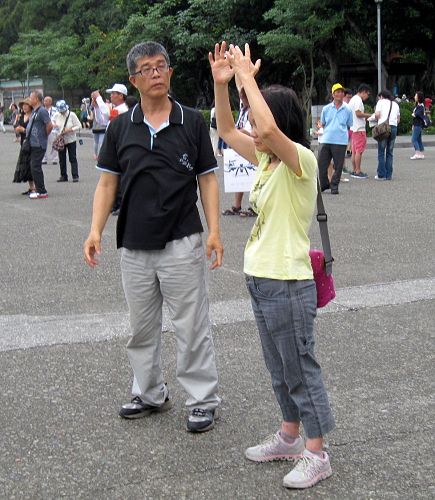 图4-6:有的民众情不自禁地站在法轮功学员旁边自己学起了功法,有的大陆游客流连忘返驻足许久舍不得离去。
