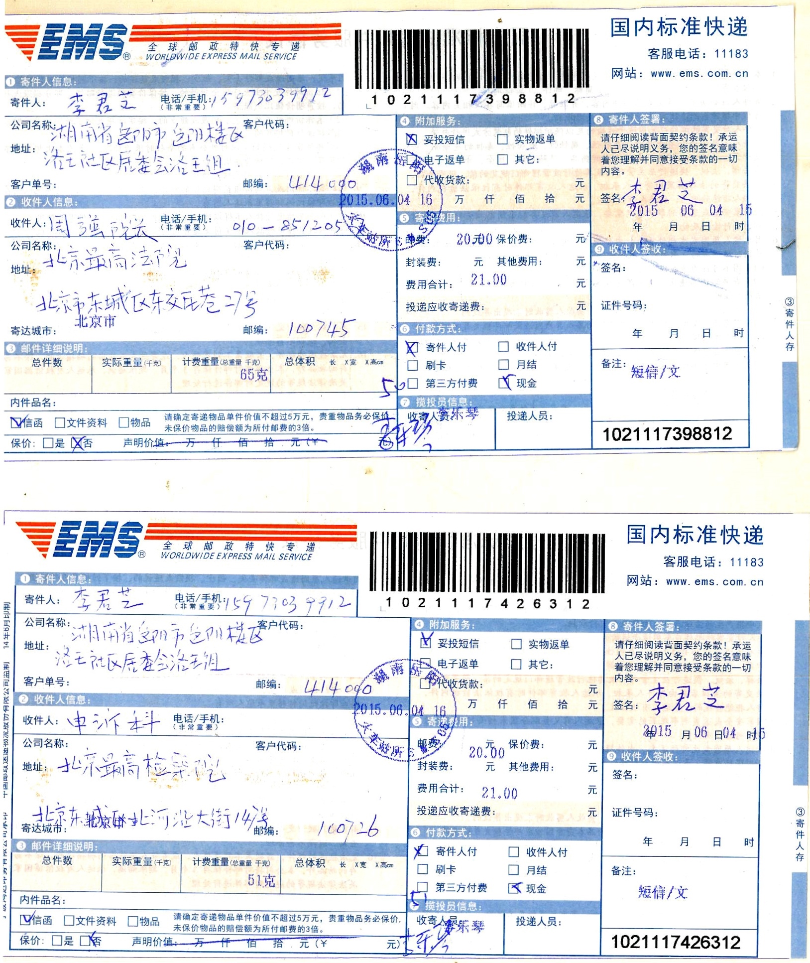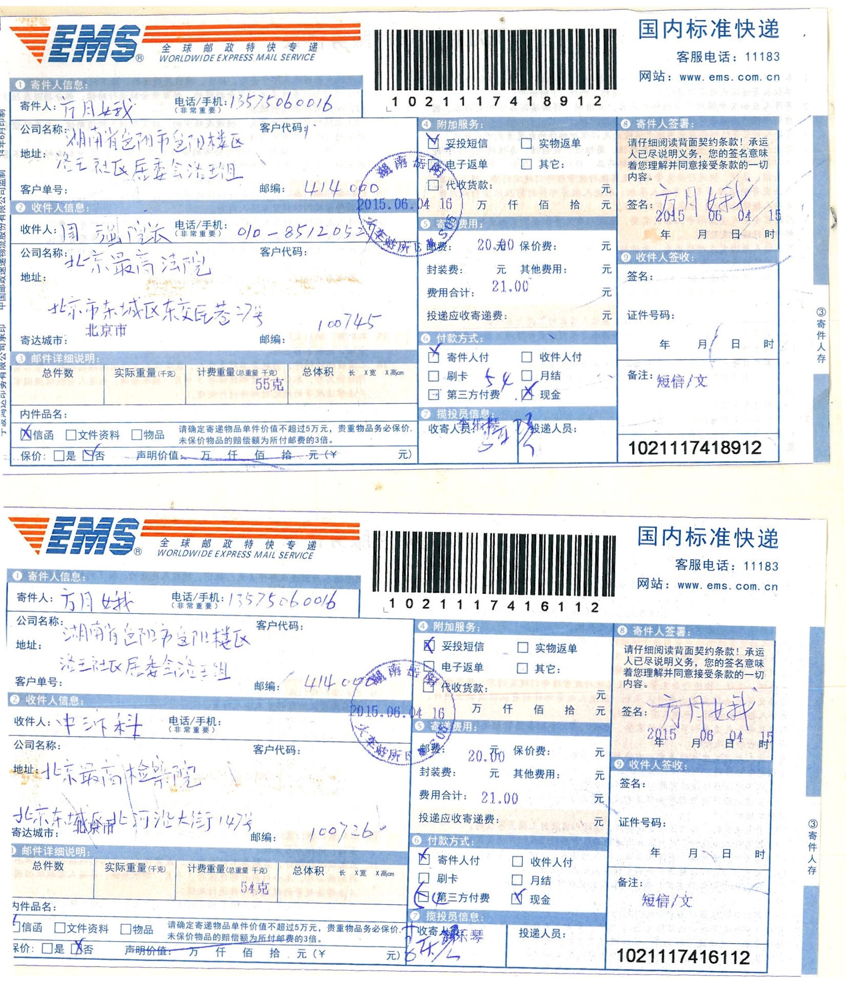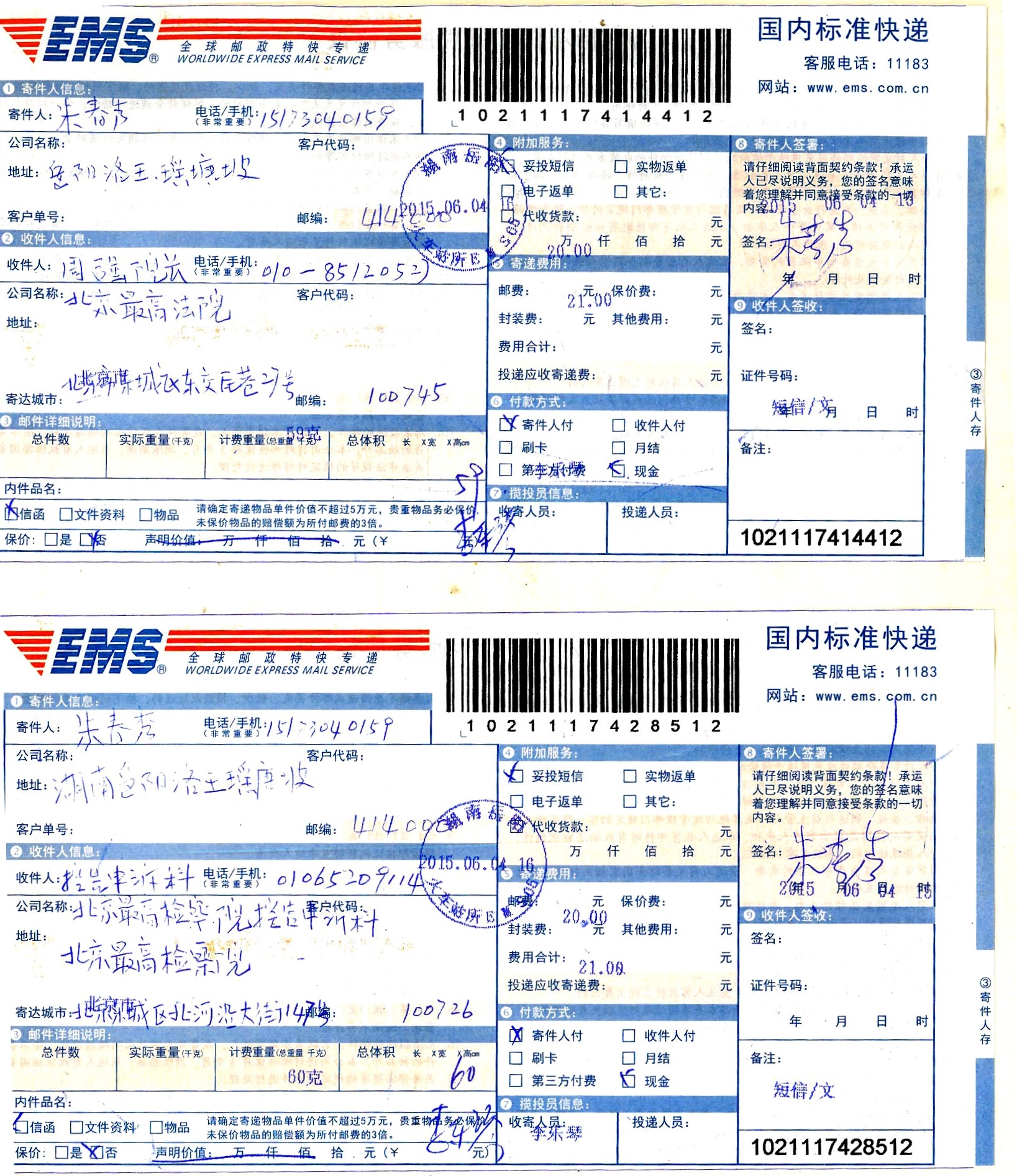 【明慧网二零一五年六月十日】(明慧网通讯员湖南报道)湖南省岳阳市法轮功学员许运四、方月娥夫妇及李鸽辉、付芳桂、朱春秀、李君芝等六人,2015年6月4日通过快递将控告前中共头子江泽民的刑事控告状寄往最高检察院及最高法院。六位法轮功学员控告江泽民发动对法轮功的灭绝性迫害,导致他们遭到绑架、关押、勒索甚至家人被迫害致死。