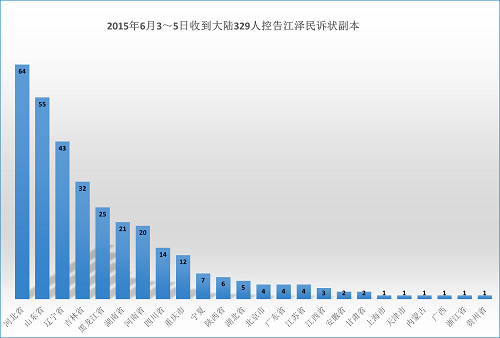 【明慧网二零一五年六月十日】(明慧网记者综合报道)六月三日至五日,明慧网又收到来自中国大陆二十省和四个直辖市共三百二十九人控告江泽民迫害法轮功的诉状副本。这些诉状来自法轮功学员和他们的家人及朋友,已经通过邮寄投往最高检察院和最高法院,要求司法机关立案,依法追究发动并维持对法轮功长达十六年灭绝性迫害的元凶江泽民的刑事责任。