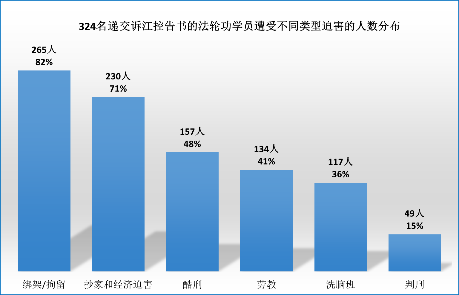 这329人中除五人是法轮功学员的家人、朋友外,其余324名法轮功学员均遭受不同形式的迫害。这324人中曾被绑架并非法拘禁在拘留所或看守所的有265人,占324人的82%;230人被抄家或遭受其它经济迫害(诸如勒索钱财、非法开除、扣押工资奖金或退休金等),占71%;被关押期间遭受毒打或电棍电击、野蛮灌食、吊铐折磨、铐在铁椅子上、不准睡觉等酷刑折磨的有157人,占48%;被劳教迫害的有134人,占41%;被关入洗脑班迫害的有117人,占36%;被非法判刑的有49人,占15%。