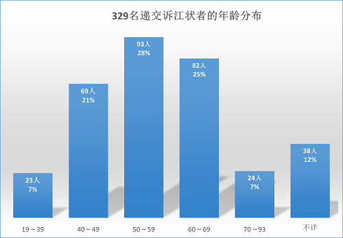 江泽民发动的这场迫害给法轮功学员和他们的家人造成的伤害,我们从这三百二十九人发来的诉江控告书中可窥见一斑。这三百二十九人来自河北省、山东省、辽宁省、吉林省、黑龙江省、湖南省、河南省、四川省、重庆市、宁夏、陕西省、湖北省、北京市、广东省、江苏省、江西省、安徽省、甘肃省、上海市、天津市、内蒙古、广西、浙江省和贵州省。他们中有公司职员、教师、工程师、工人、农民、政府公务员、铁路职工、国防部公务员、医生、纪检办主任、银行职员、生意人、财务工作者、党务秘书、交通局职工、司法所职工、工商局干部、离退休干部、地质队人员、技术监督局局长、采矿工程师、炼油工人等。他们当中年龄最小的是十九岁的吉林市聂威暕,年龄最长的是九十三岁的山东省招远市谢淑美。年龄分布如下图: