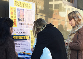 六月八日下午,多伦多部分法轮功学员在驻多伦多中领馆附近的圣乔治大街和布鲁大街举行真相长城活动,以声援正在全球兴起的控江大潮。