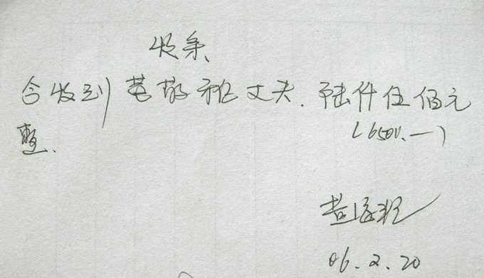 ![]() 董敬雅被马三家劳教所经济勒索:马三家管教黄海燕于二零零六年二月二十日写的收条:今收到董敬雅丈夫六千五百元整。 |