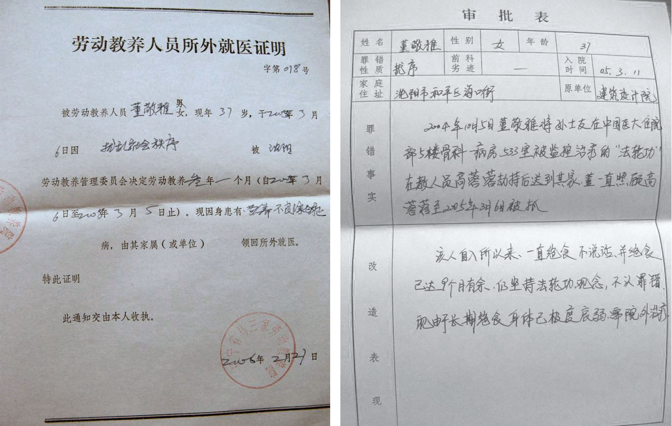 ![]() 辽宁省马三家劳教所“所外就医证明”与“审批表”(表中年龄三十七岁写的是高蓉蓉的年龄) |