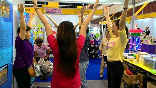 ![]() 图1:二零一五年泰国健康博览会上,人们纷纷来法轮功展位了解功法 |