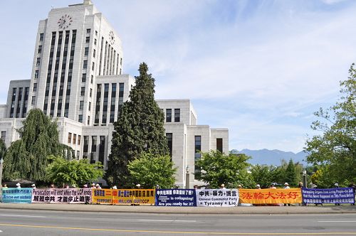 温哥华法轮功学员在市政厅前沿街拉起横幅,责令中共停止迫害