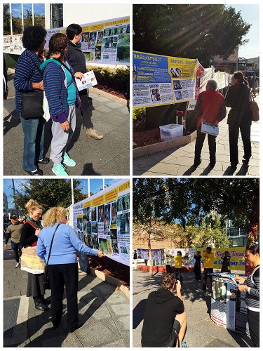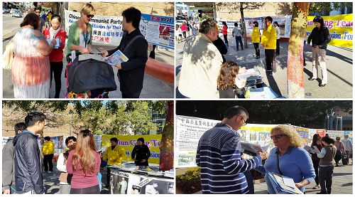 法轮功学员们在马路两旁真相横幅之间穿梭,忙着帮华人做“三退”。明真相的华人一边谴责中共、一边乐呵呵地做着“三退”。