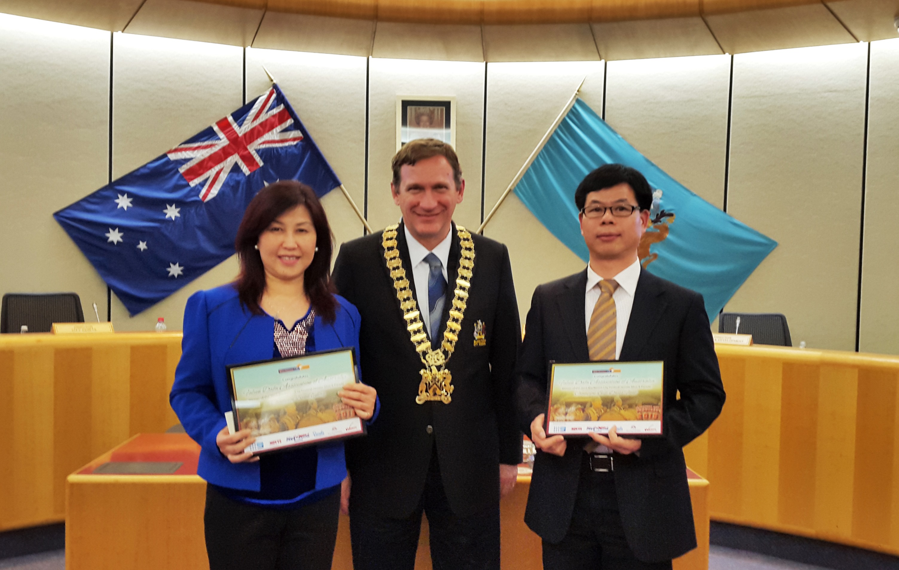 图1:黑镇市长斯蒂芬·巴厘先生(Stephen Bali,中)授予澳洲法轮大法学会二零一五年黑镇城市文化节游行活动“最佳乐团”和“最佳服饰”两个大奖