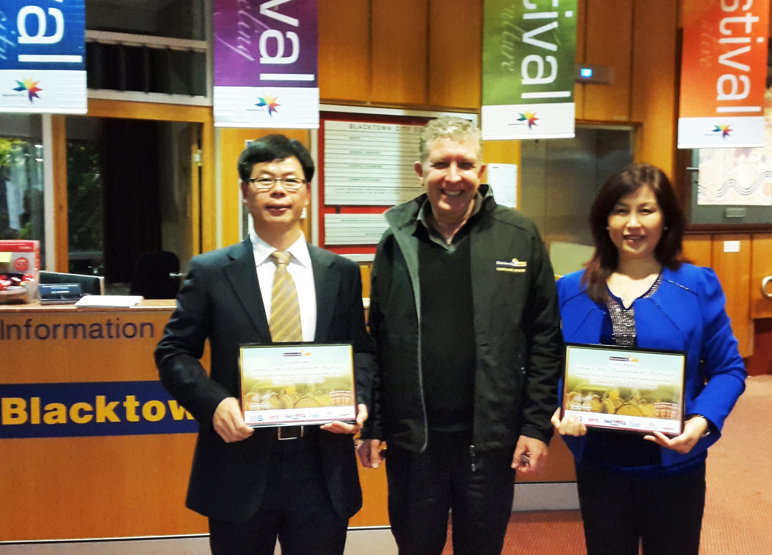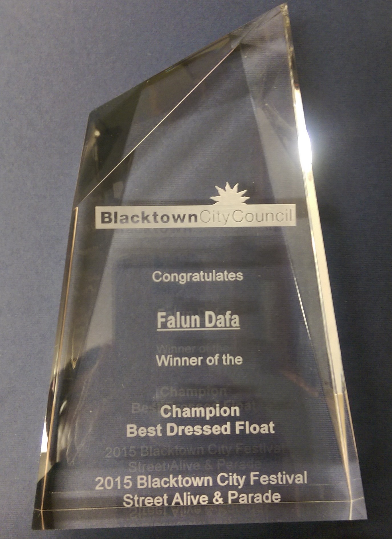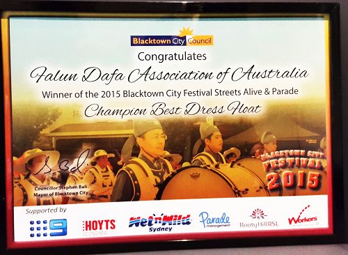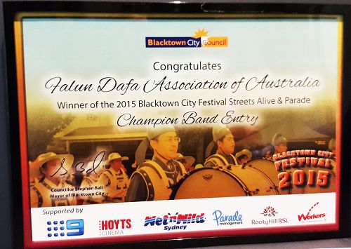 【明慧网二零一五年六月十九日】(明慧记者华清悉尼报道)六月十七日晚,在澳洲悉尼最大城镇——黑镇的市政厅议会颁奖仪式上,黑镇市长斯蒂芬·巴厘先生(Stephen Bali)面对全体市议员和秘书长等官员以及本地各团体代表近百人宣布:现授予澳洲法轮大法学会二零一五年黑镇城市文化节游行活动“最佳乐团”和“最佳服饰”两个大奖和一千澳元奖金。