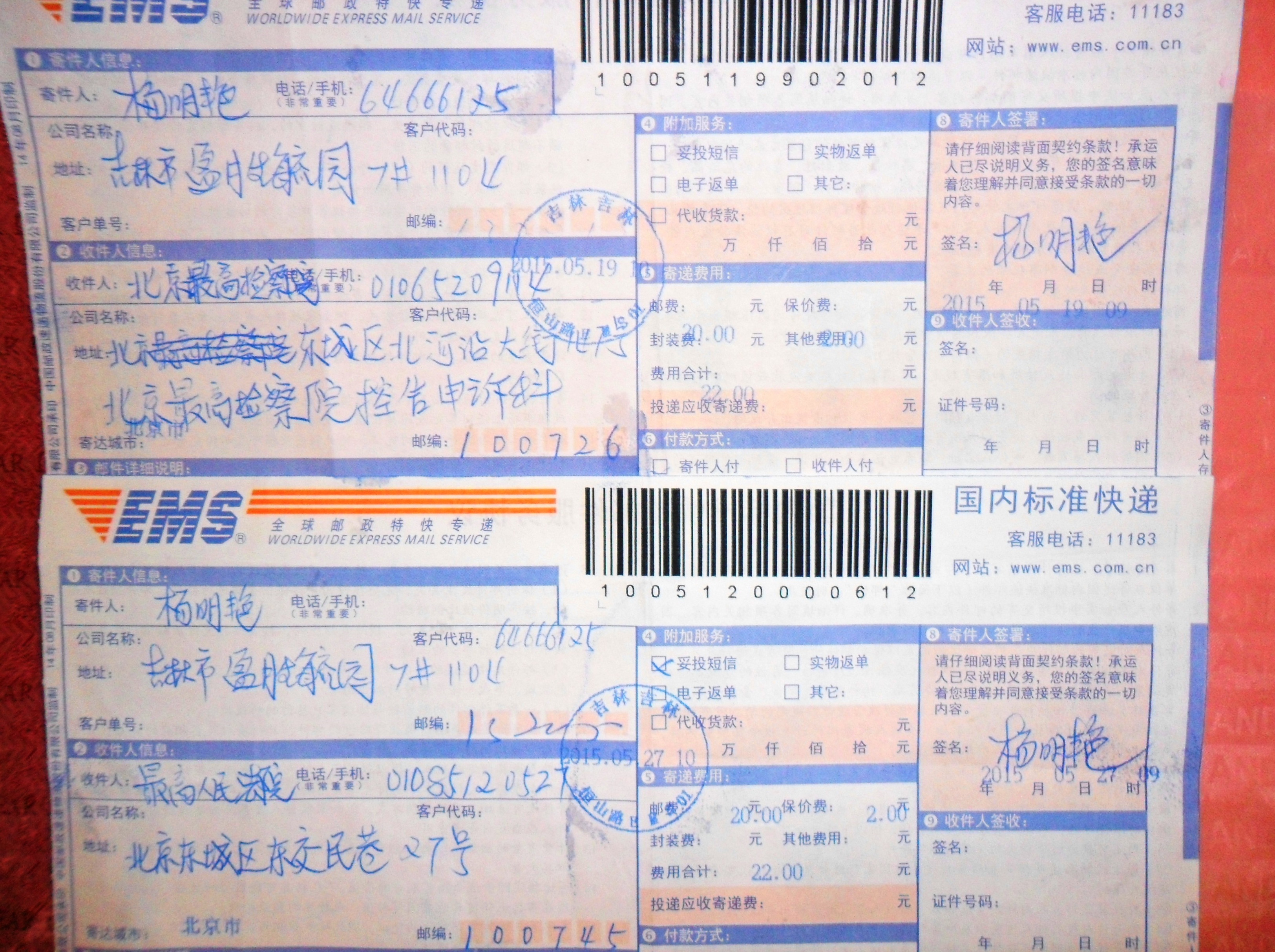 【明慧网二零一五年六月二日】(明慧网通讯员吉林报道)吉林市八名法轮功学员(许传林、郑明霞夫妻,梁宝范、刘俊梅、梁晶一家三口,王文君,关辉,杨明艳),近日控告迫害元凶江泽民,把“刑事控告书”寄到最高检察院。