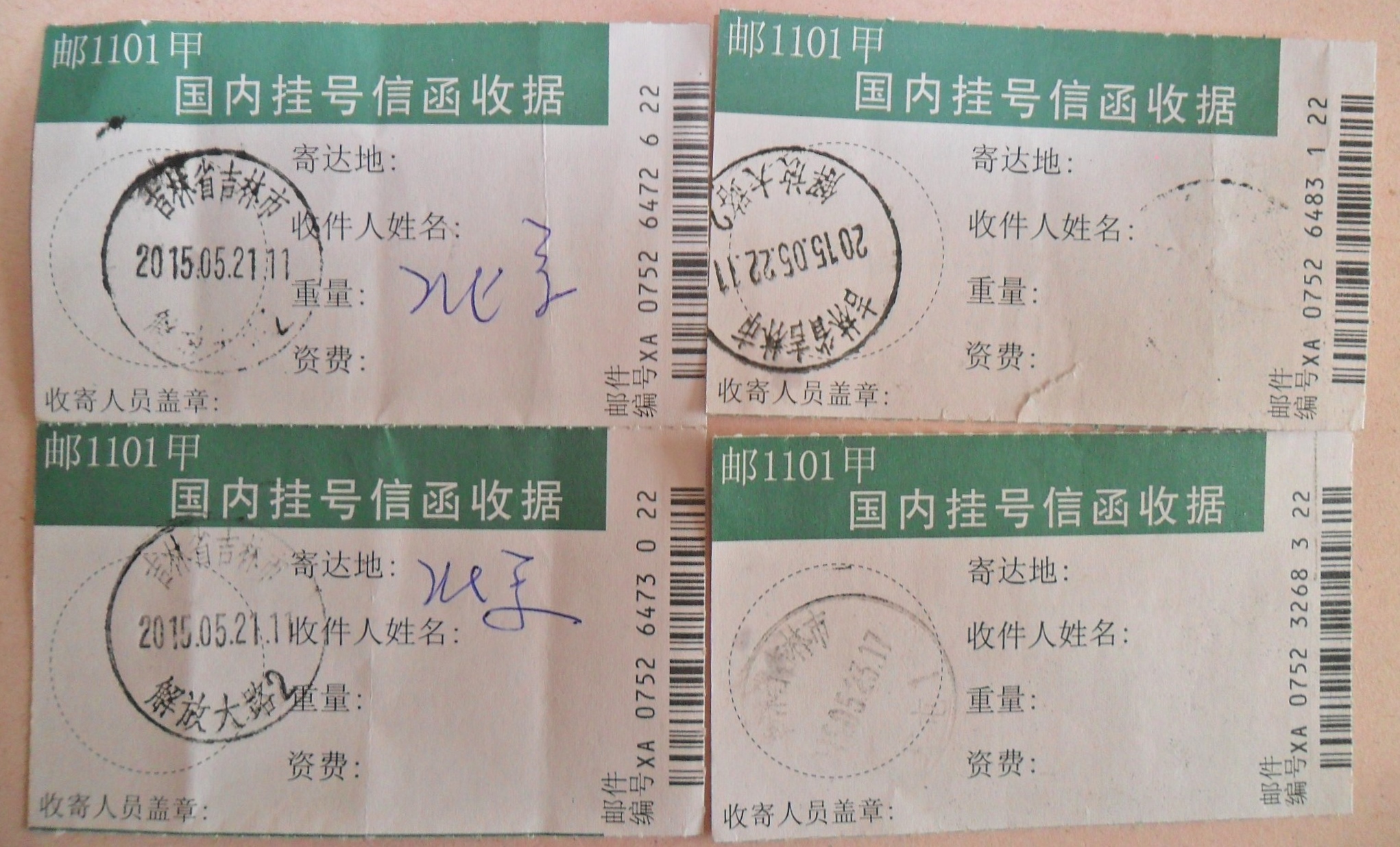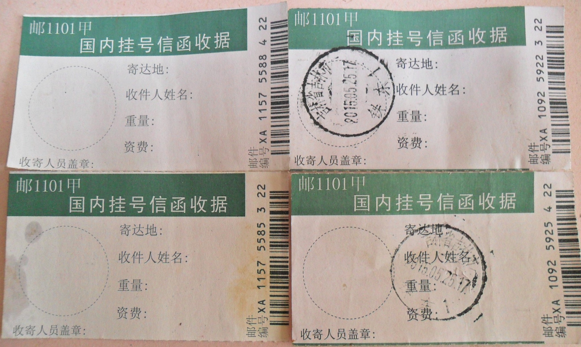 梁宝范、刘俊梅夫妻和女儿梁晶邮寄诉状的收据
