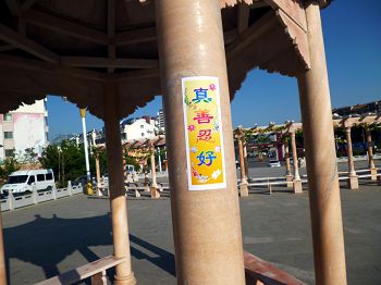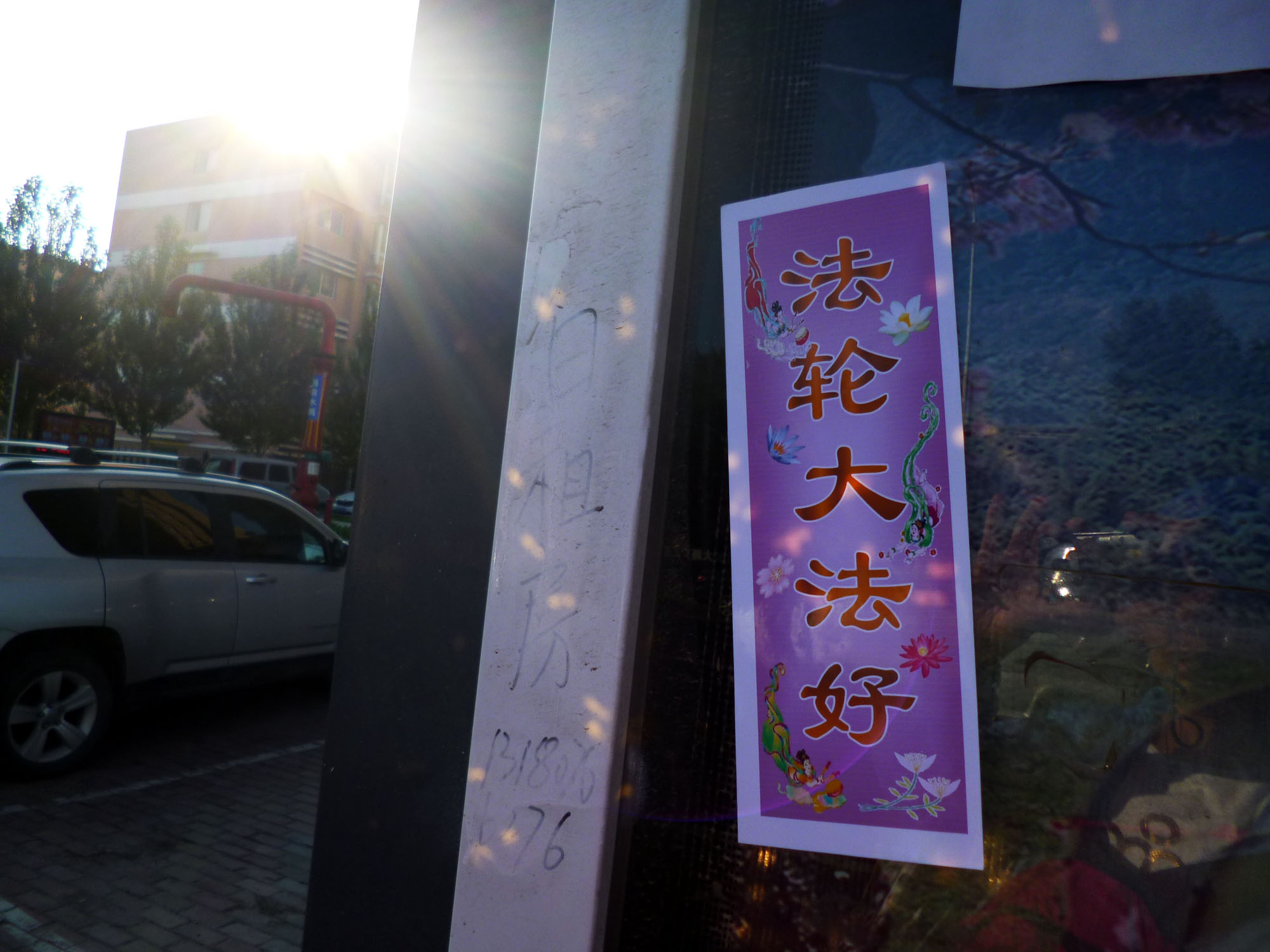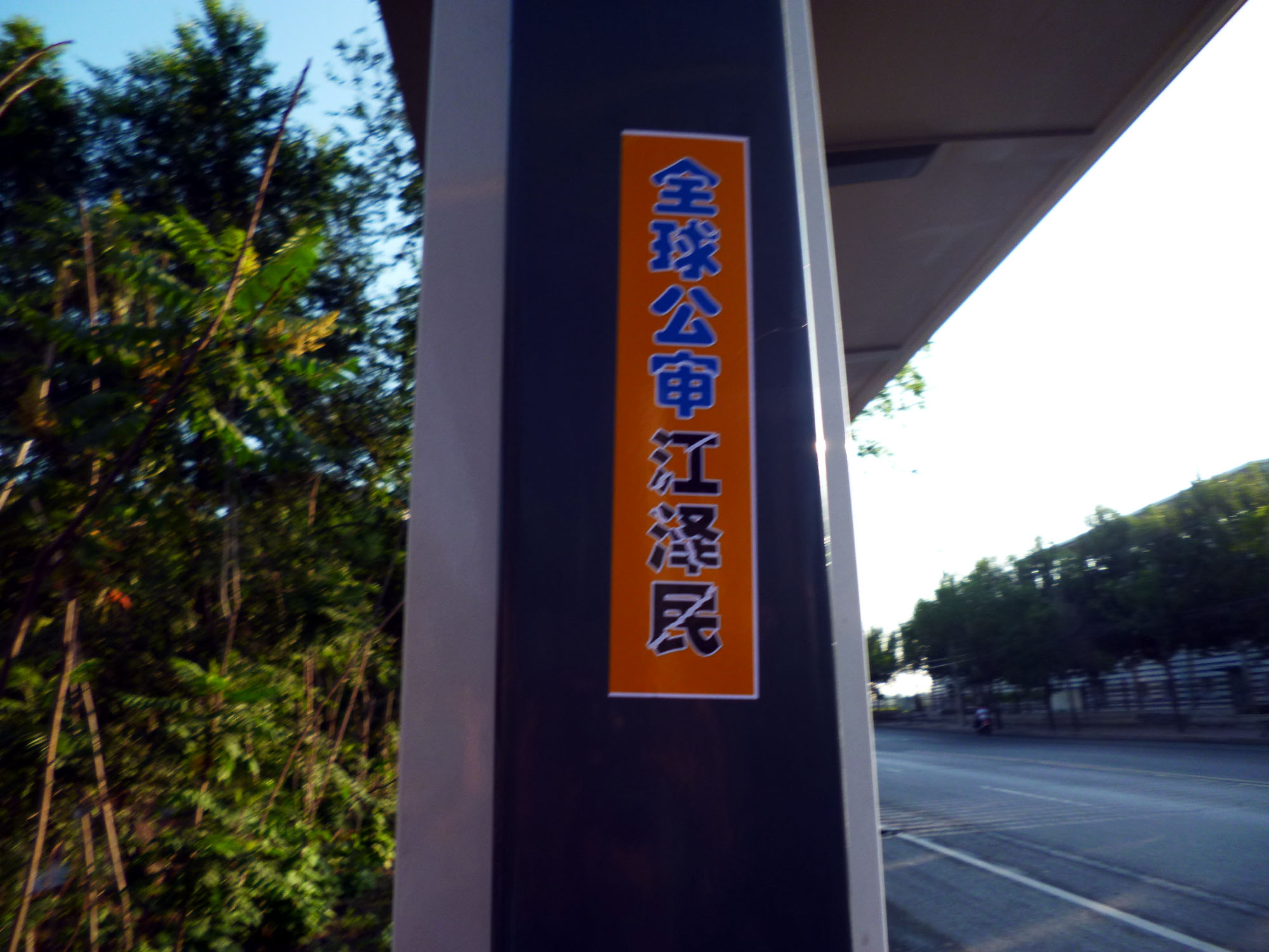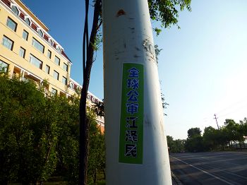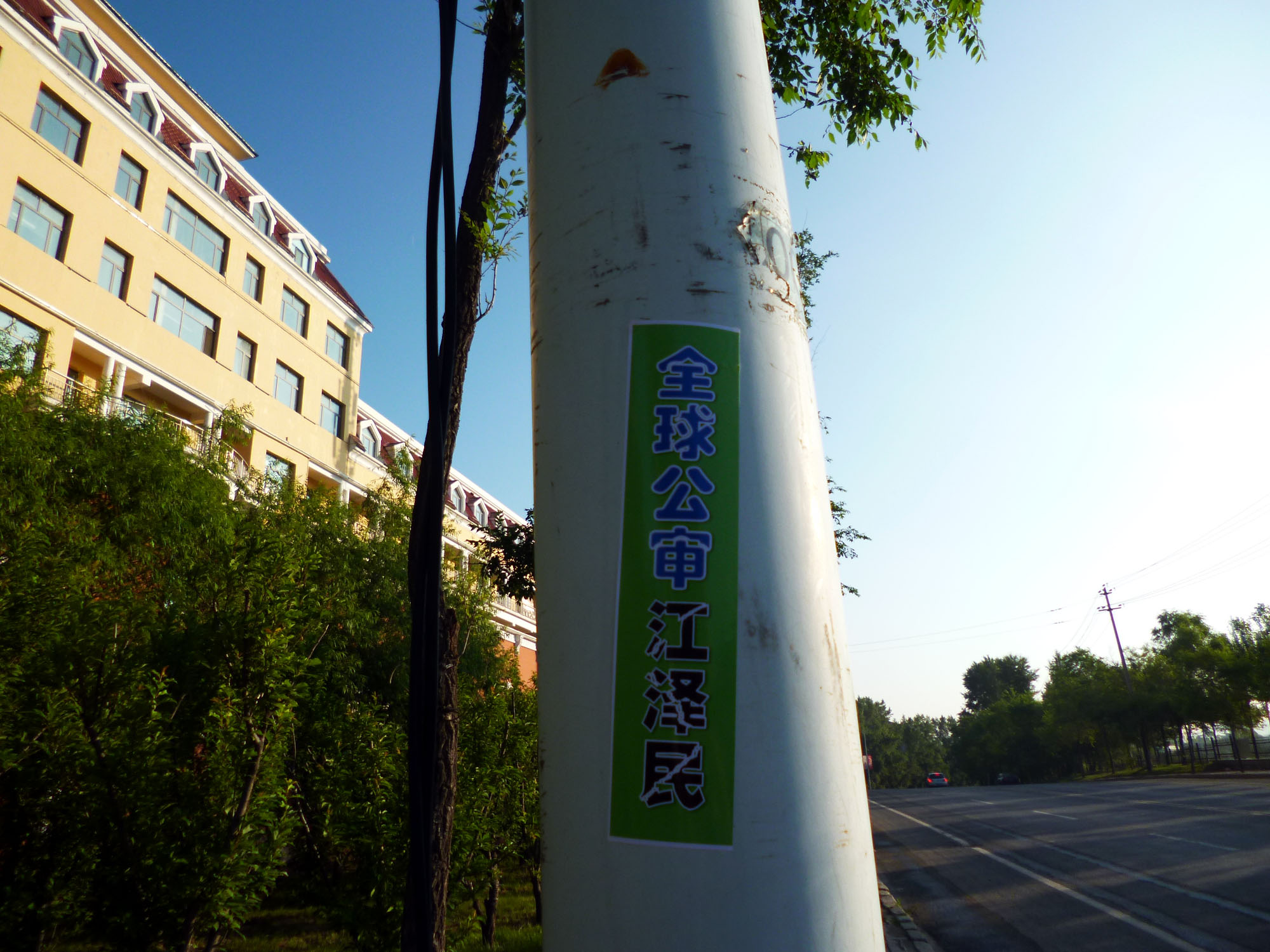 2015年6月20日,端午节那天,在吉林省吉林市的大街小巷,人们可以看到“全球公审江泽民”、“法轮大法好”真相标语和小卡片,这是法轮功学员张贴的真相,把福音传给节日的人们。