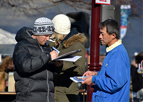 - 国际瑜伽日 有缘人学炼法轮功(图)- 法轮功学员的展位前,很多人被平和舒缓的功法演示所吸引,纷纷询问哪里有教功班,也有些人现场就开始学炼。