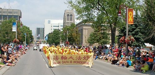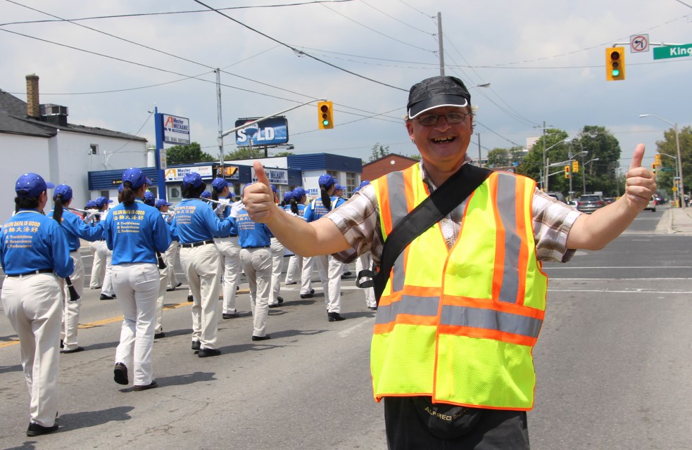 观众Gerry对着法轮功的队伍鼓掌和欢呼:“你们真棒!欢迎你们!”他对记者说:“他们是一个很平和的团体,我非常喜欢他们。他们演奏得很用心,音乐非常振奋人心。每年他们的到来都给奥沙瓦的民众带来欢乐,给多元文化节做出很大的贡献。”