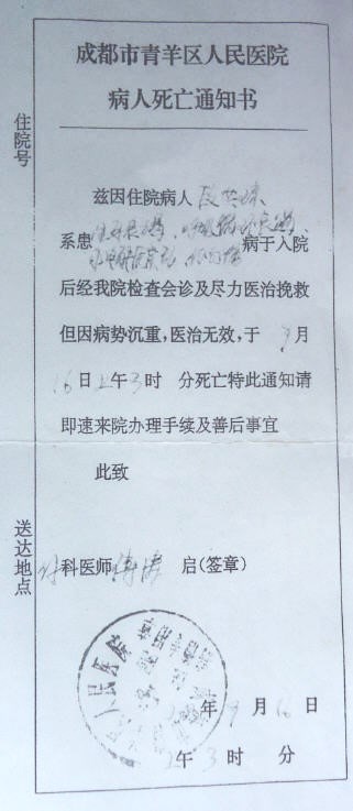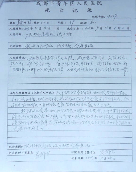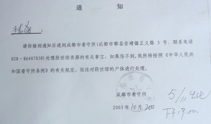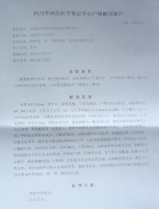 段世琼于二零零二年八月二十九日,被成都市公安局非法抓捕,关押于成都看守所。从二零零二年被抓捕直到二零零三年九月十六日被迫害致死,整整一年多时间段世琼从未被家人接见过,包括段世琼生命垂危的数十天恶警都未通知家人。九月十七日段世琼家人收到看守所发来的死亡通知书得知:段世琼因不服法院对其长达七年的非法判决和对大法弟子的非人迫害,于二零零三年七月十五日(说是七月二十四日)开始绝食抗议,于八月十一日被送往成都青羊区人民医院,遭受了恶警、恶医的野蛮摧残、灌食和滥施药物迫害。据悉,2003年9月15日晚上,也就是段世琼离世的那个晚上,值班医生是傅涛,当段世琼痛苦万分,呻吟不止时,不闻不问。直到16日凌晨3时,段世琼含冤离世,傅涛才漫不经心的走进病房,将她的脸转向被铐在另一病床上的大法弟子,冷酷地说:“过几天你也是这个下场。”