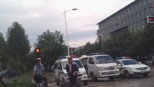 法院南门路上有九辆警车,其中有两辆依维柯 法院东大门