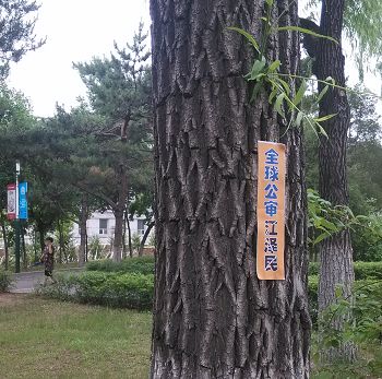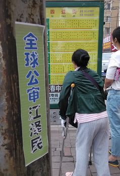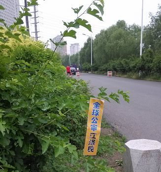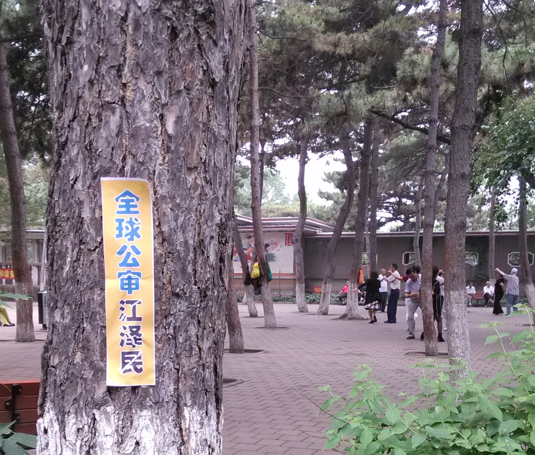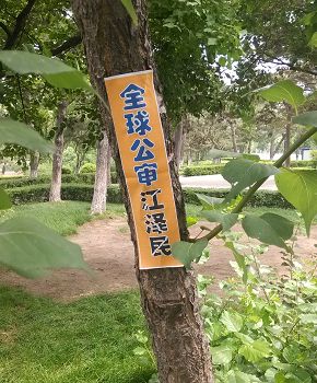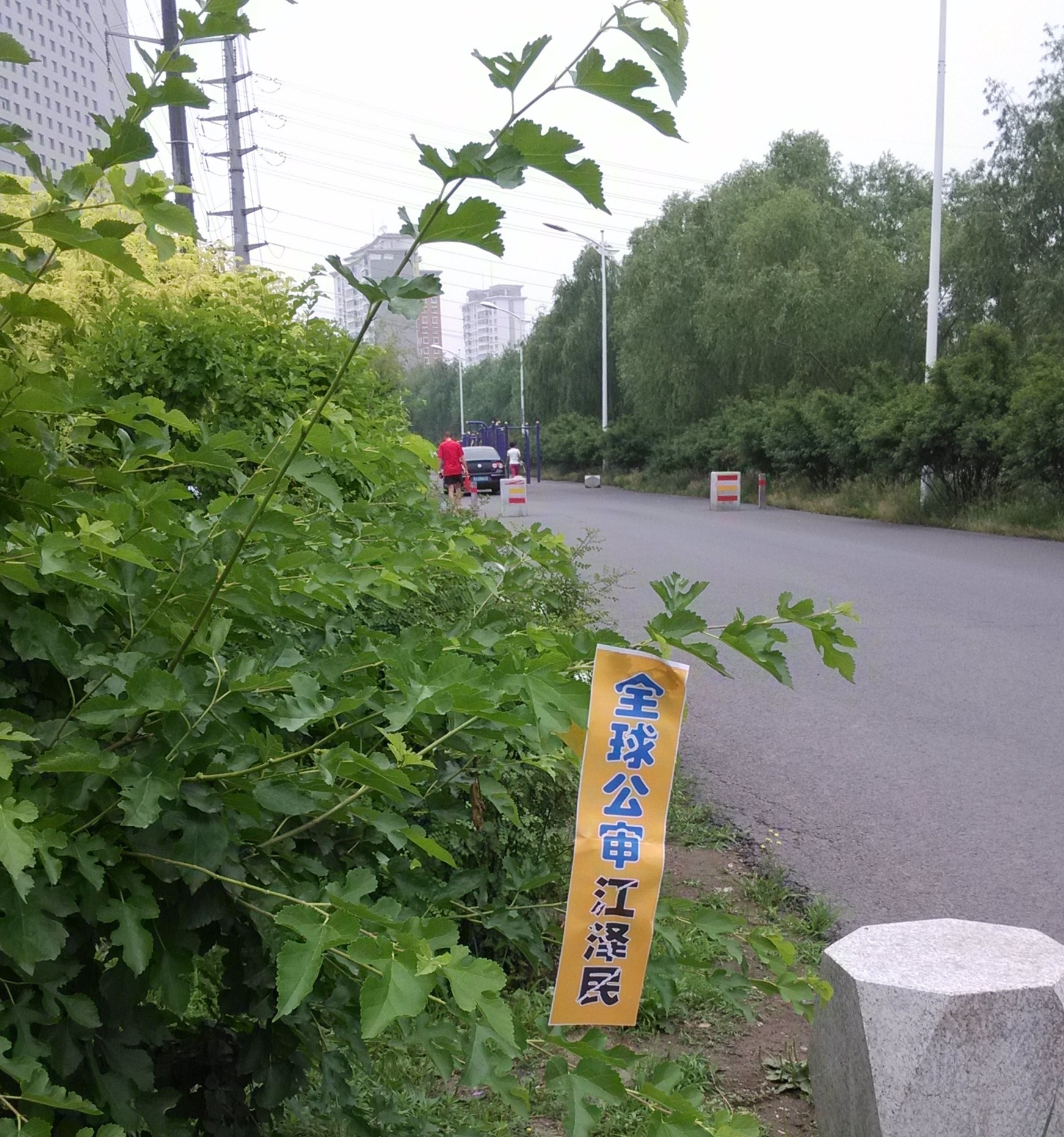 法轮功的元凶江泽民,这一讯息也在大陆民众中迅速传播。近日,长春大街小巷、公园等多处出现“全球公审江泽民”的标语。