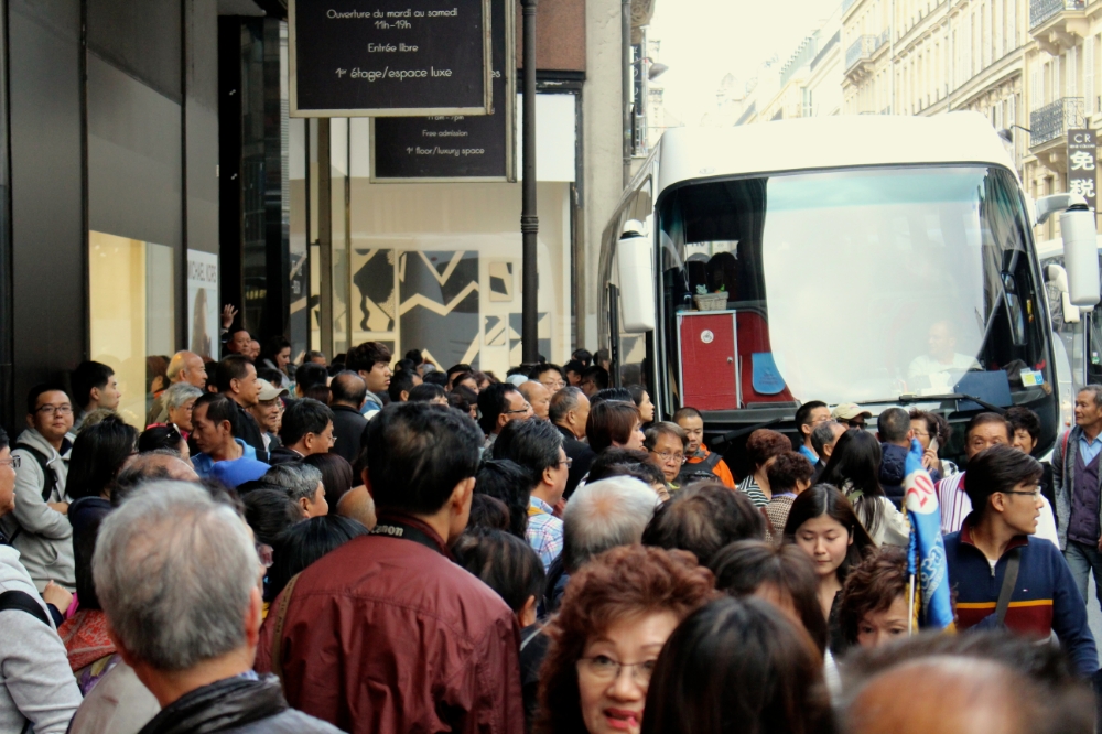 ![]() 图1:文章刊登照片,每天一拨接一拨来巴黎奢侈品店Galeries Lafayette购物的数百上千中国大陆旅游者。 |