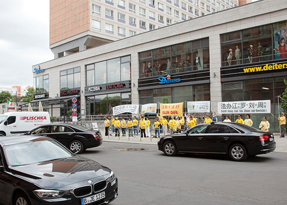 六月二日,上海市委书记韩正及代表团在汉堡时,汉堡市政府批准法轮功学员在双方会谈的汉堡商会中心正门口抗议迫害。