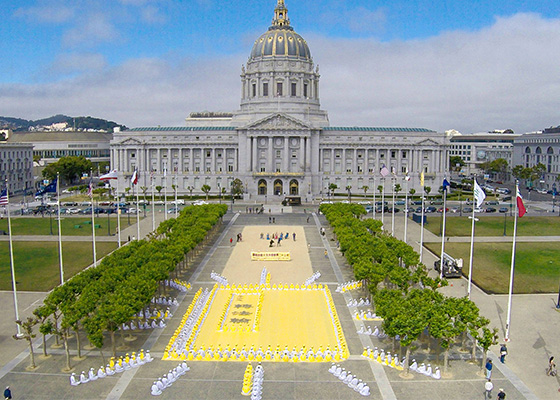 六月六日,四百多名法轮功学员在旧金山市政厅广场排字弘法,向人们展现法轮大法的美好。