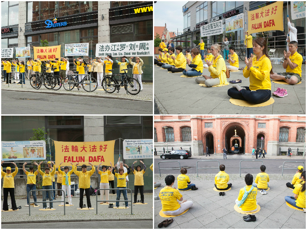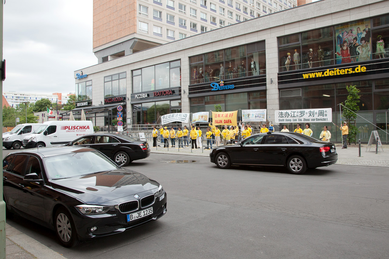 ![]() 柏林当地的法轮功学员在市政厅车辆进出的路口举行和平抗议活动 |