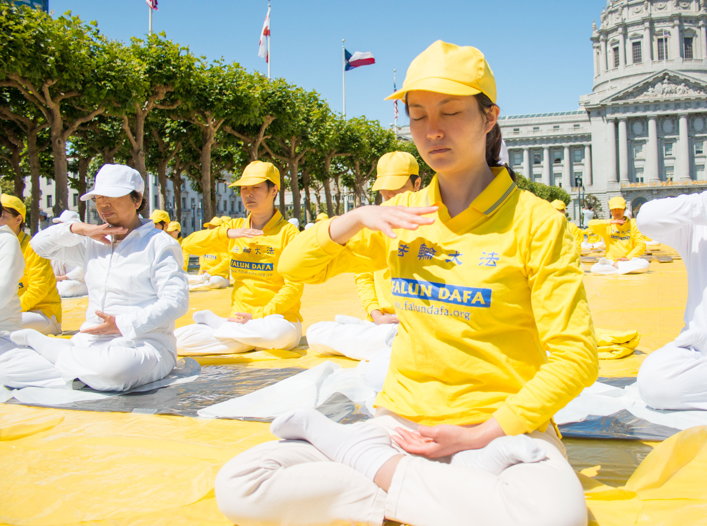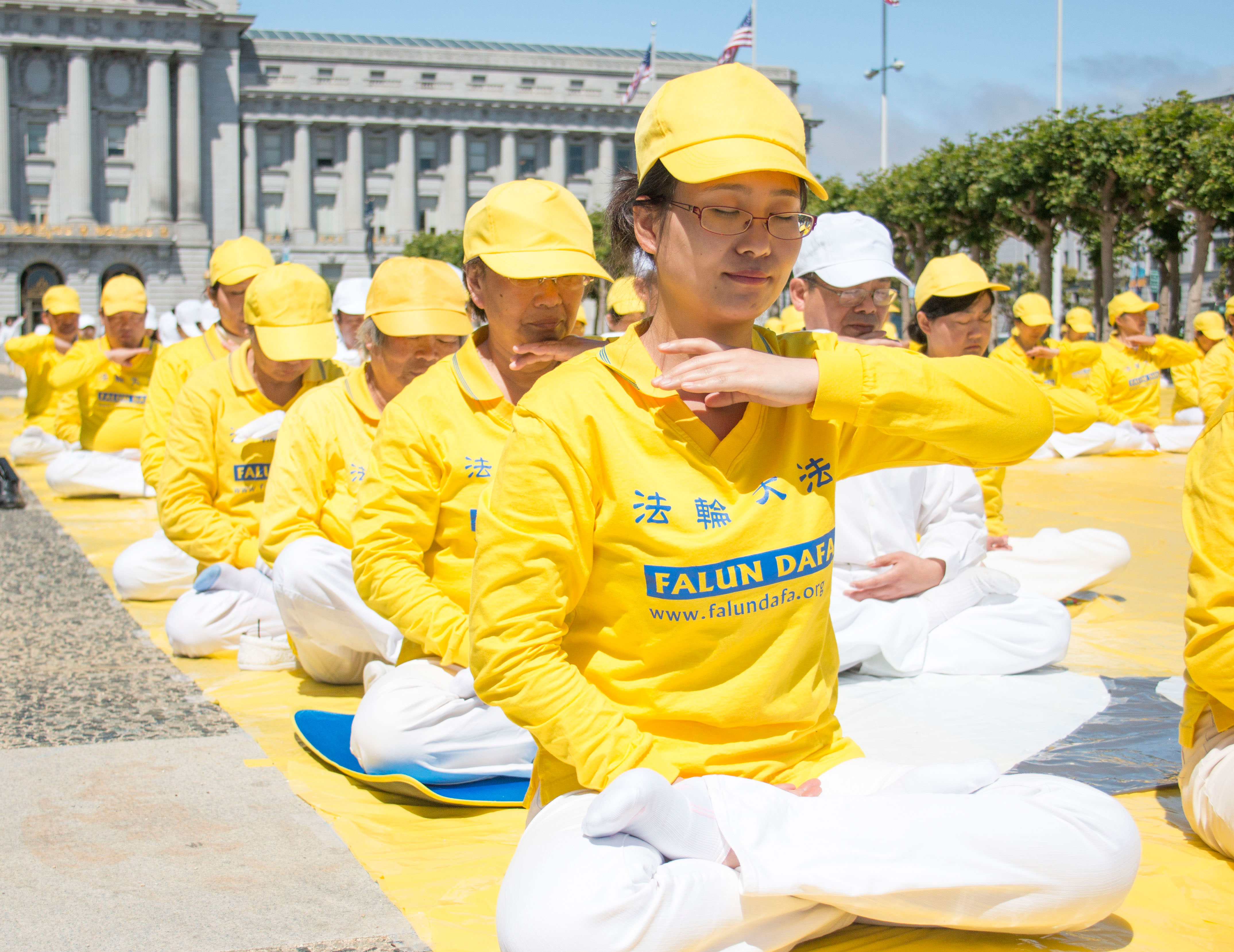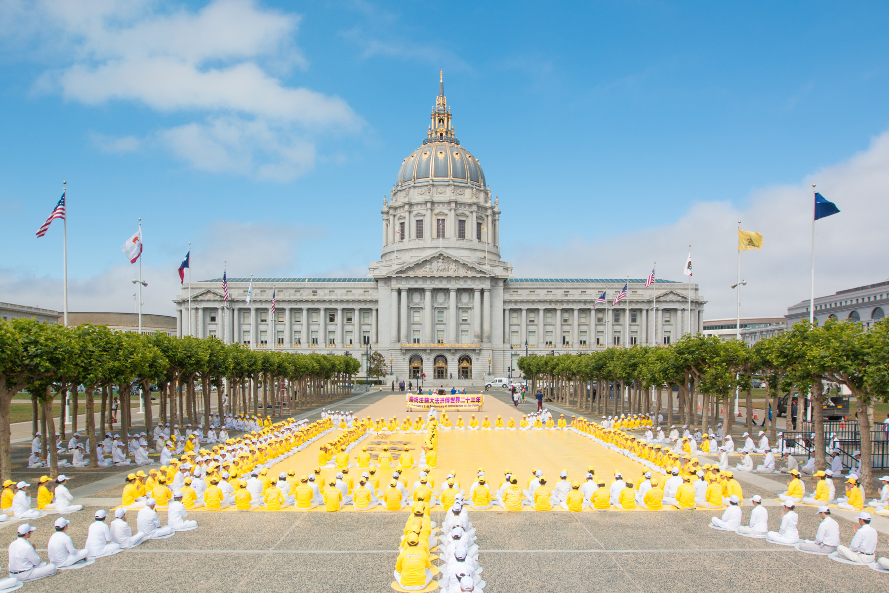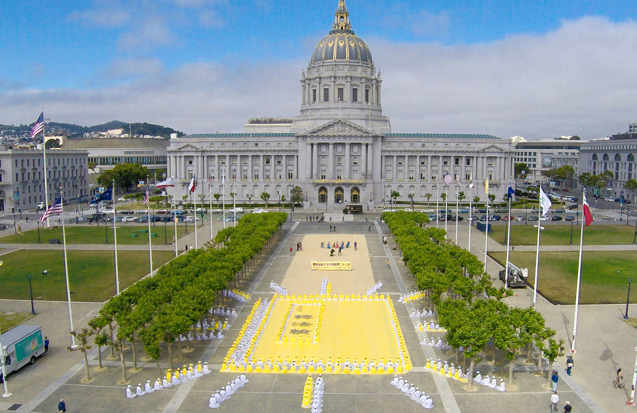 【明慧网二零一五年六月七日】(明慧记者王英美国旧金山报导)二零一五年六月六日,四百多名法轮功学员在旧金山市政厅广场排字弘法,向人们展现法轮大法的美好。