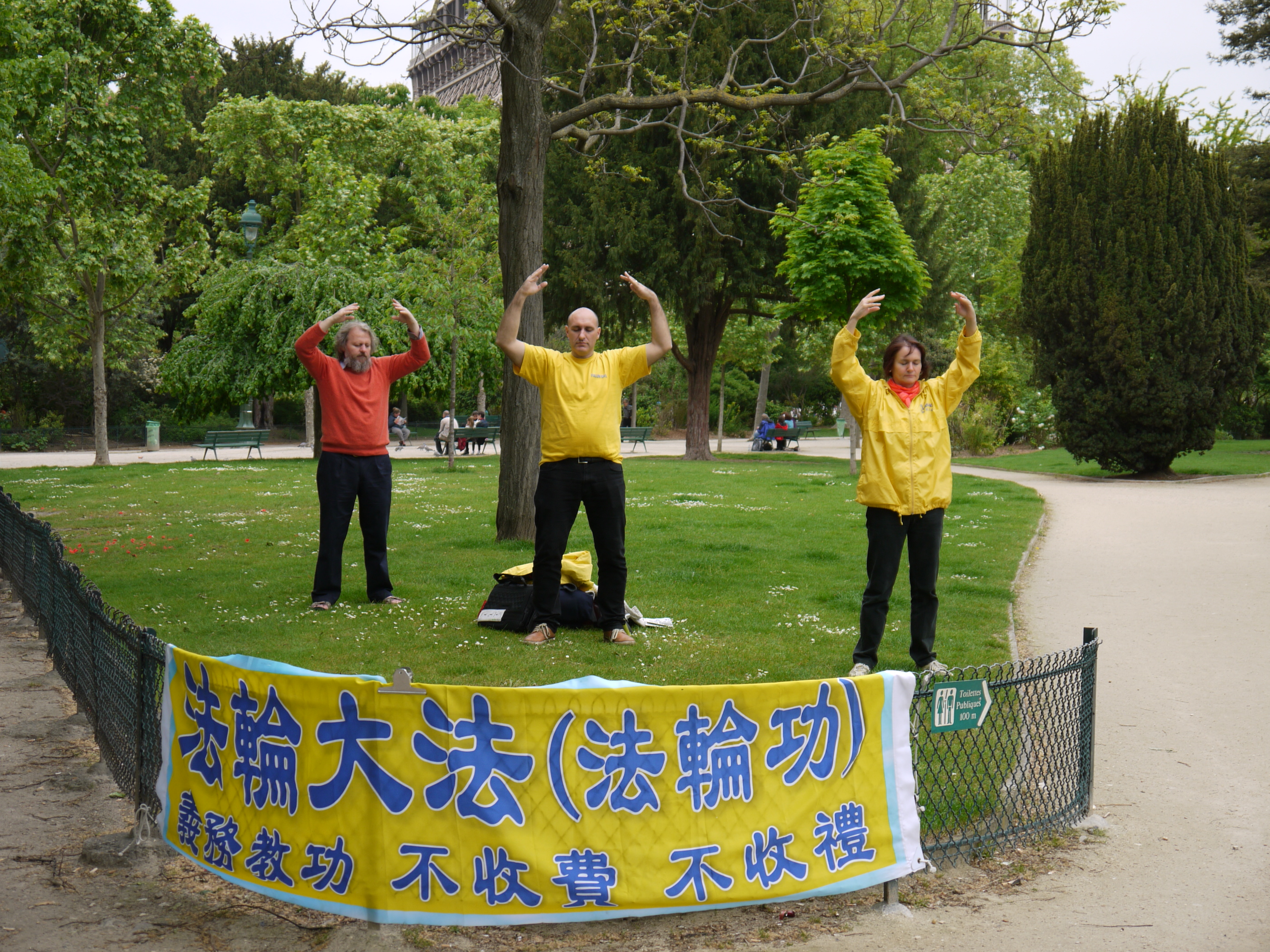 真相点新增了炼功活动。一次景女士正静静地打坐,几个中国游客路过,一女游客说:“这法轮功的人都可善良了。”之后听见一个男的声音高喊:“法轮大法好!”然后这个女游客也跟着喊:“法轮大法好!真善忍好!”一行人过去了。等到炼站桩抱轮时,他们又都回来了,这个女游客走近景女士,对她说:“有没有炼功音乐?你能不能给我炼功磁带?”景女士说:“这样吧,给我你的电子邮箱,我寄给你。”不一会儿,她把写在一张小纸条上的电子信箱地址交给了景女士。