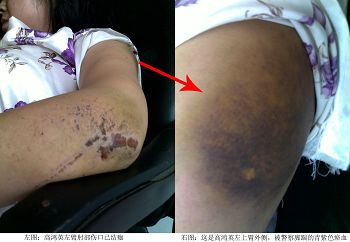 3、二零一一年七月一日凌晨我和丈夫在黑山县一高中门前被黑山县公安分局的三个恶警绑架。丈夫被一个恶警卡住脖子昏过去,然后又被两个恶警压在地上,用膝盖压顶在肝部,造成内伤。