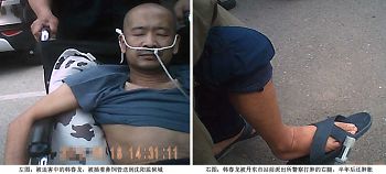 4、二零一二年十二月十一日,韩春龙和同事出差,住在丹东火车站的丹铁宾馆,上午九、十点时被警察抓到站前派出所。警察拿了几张白纸,让他摁手印,被他拒绝。警察李玺华,扇韩春龙的耳光,将他推倒在地,上来六、七个警察一起打韩春龙。韩春龙还不签字,他们就拽着他的手强行签字,恶警肖强往韩春龙的脸上喷辣椒水,还往他的脸上抹辣椒水,呛得他不停地咳嗽,脸上热辣辣地疼。当时韩春龙就左耳失聪,耳鸣,前胸后背疼痛,右腿被打肿。