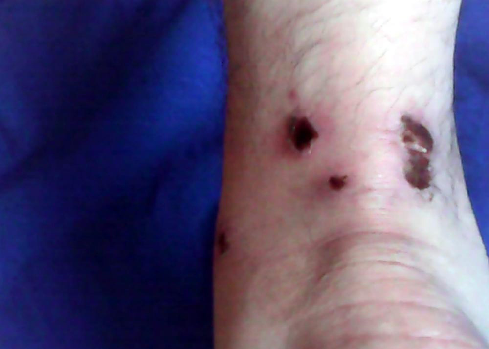 图为张国立脚腕被脚镣铐磨留下的伤痕