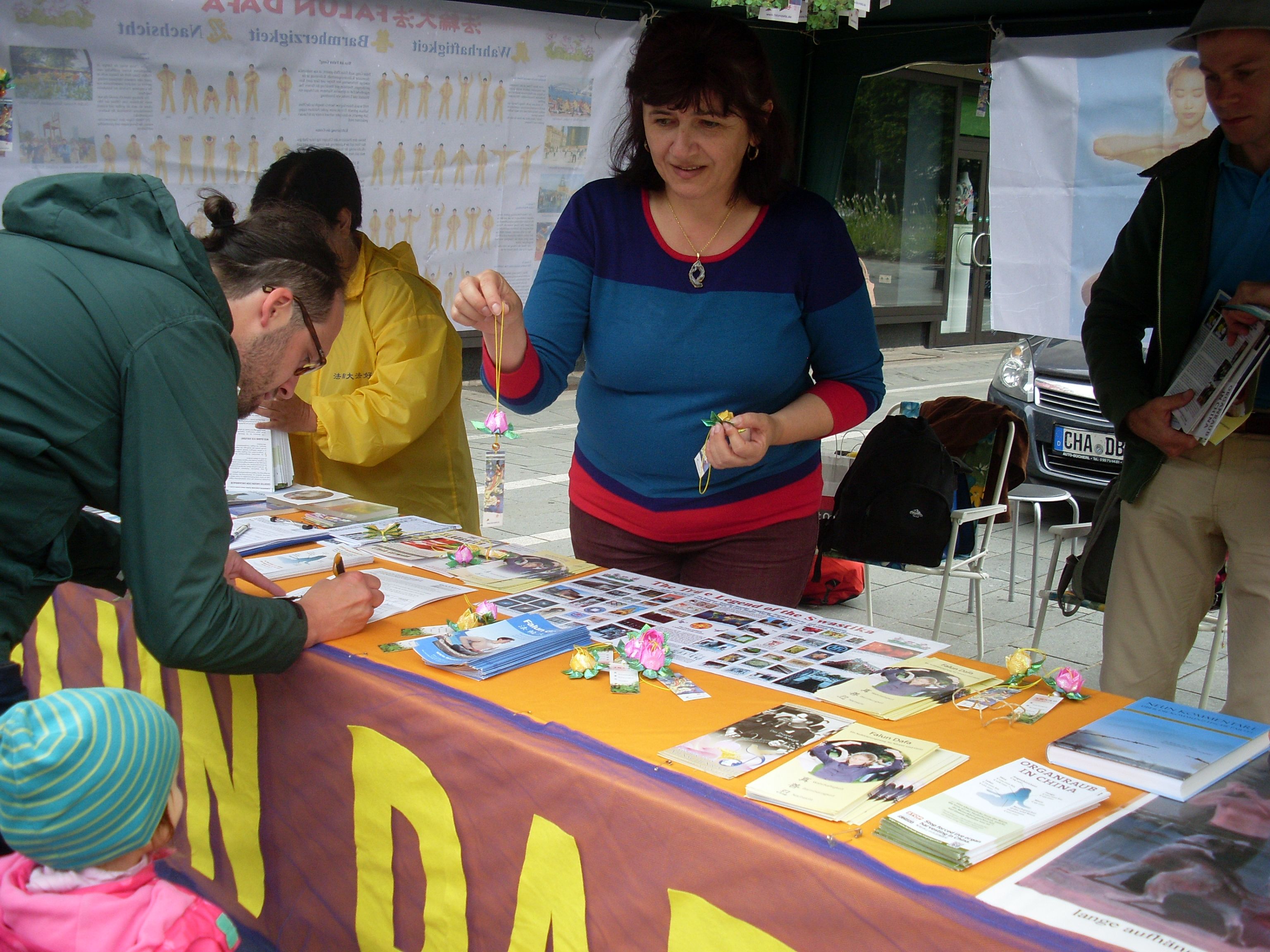有一位来自瑞士苏黎世的男士,非常详细的了解了各种有关中共活摘器官的资讯和法轮功被迫害的真相。他表示自己分别在雷根斯堡大学医院和苏黎世大学医院工作过,而这两个医院都因进行器官移植手术而著称,所以他认识不少从事器官移植手术的医生。他说他一定要把中共活摘器官的事情告诉医院的同事们,还有他参与的协会的成员们,大家都应该知道这件事,这太残酷、太不可思议了。他拿了不少相关的真相资料,想要分发给其他同事看,还表示要进一步了解事情的真相。