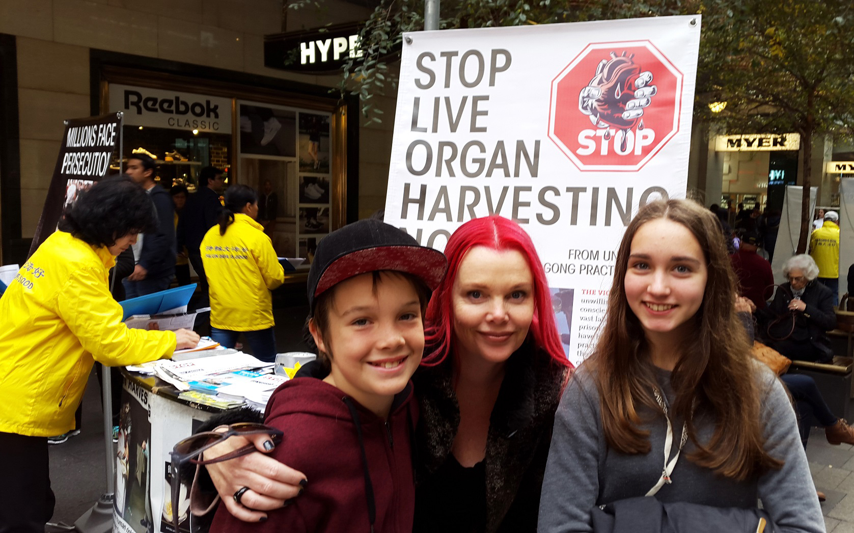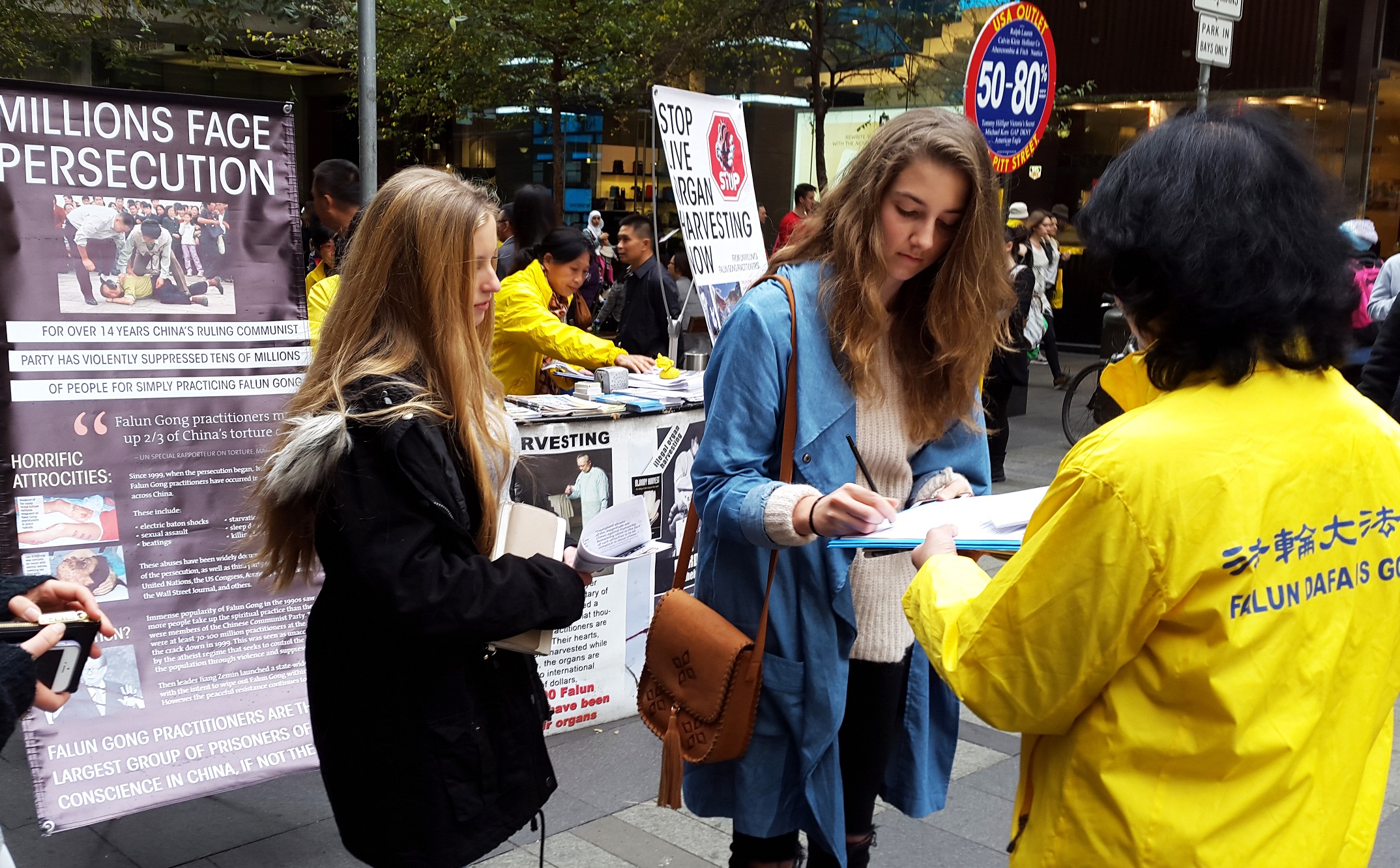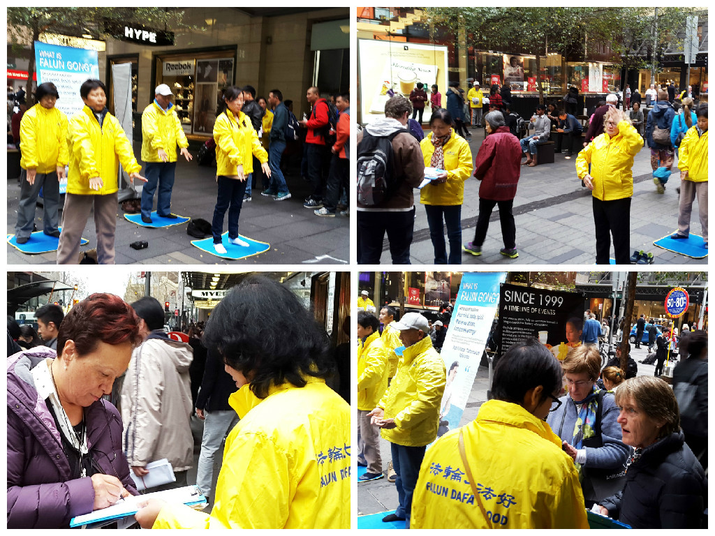 这个状况持续发生在悉尼最繁华商业主街皮特街(Pitt St)上,每周五下午澳洲主流社会各阶层的很多家庭或一群群的朋友,一个个挨着或等候着在那些身着黄衣服的法轮功学员面前签名支持反“活摘”。