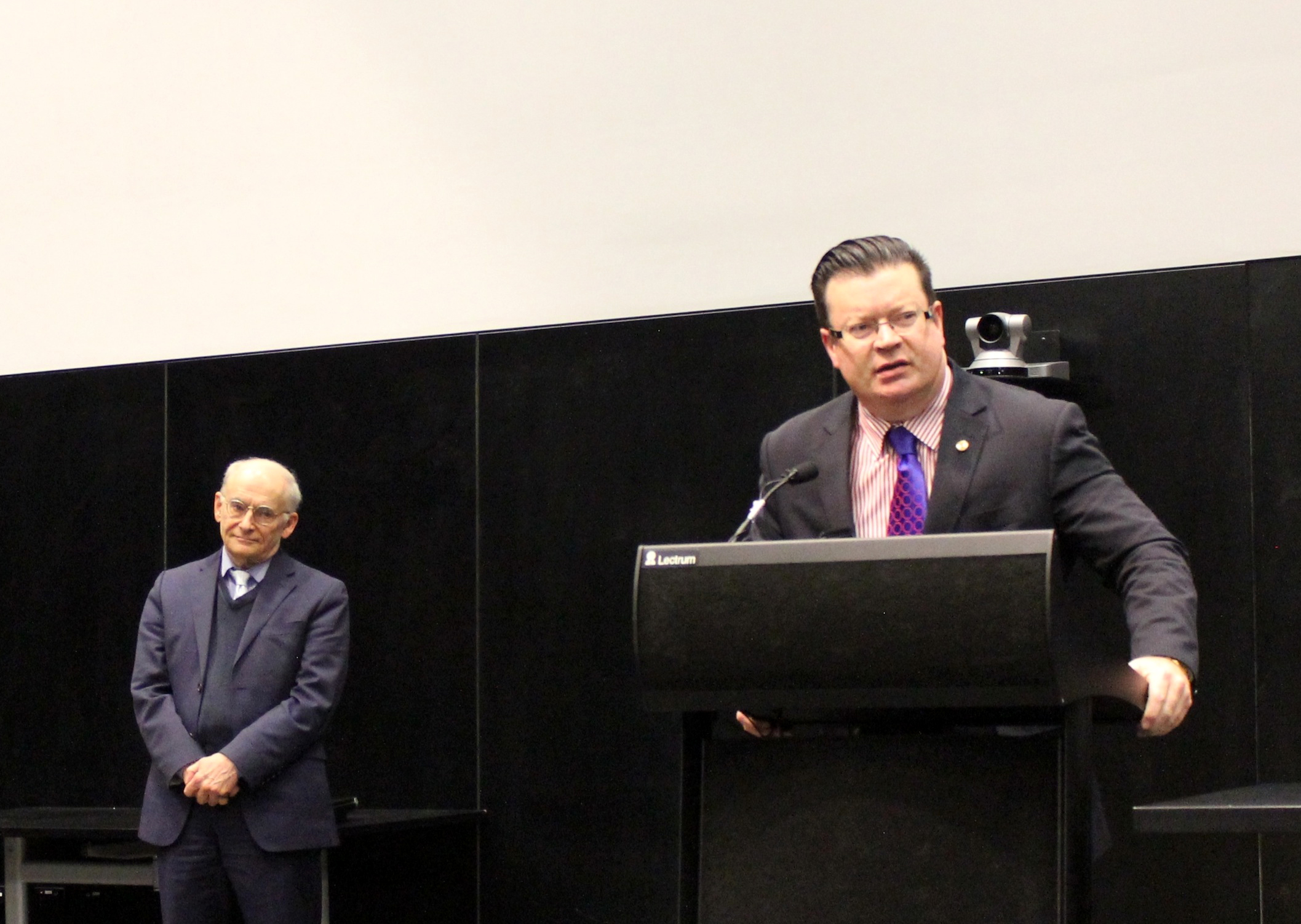 维省自由党上议院议员伯尼菲恩(Bernie Finn MP)先生(右)在演讲中,左为麦塔斯先生。