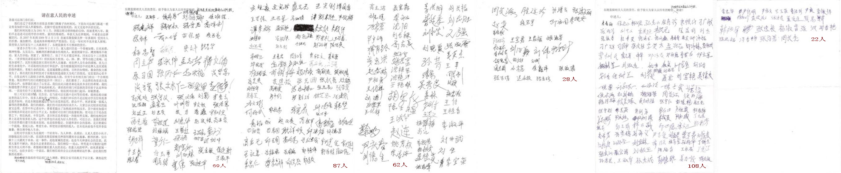 二零一零年三月间,家乡五个村的376位村民也联名签字致信政府,支持我们申诉。我们将联名申诉材料专递到中共中央办公厅及两会信访机构等部门,希望能得到重视。这么多民众的签名引起了当局的恐慌,派人调查,他们不是去监狱了解情况,而是拿着申诉状上376名村民的签名去挨个录口供:“谁找你签的名?你不要参与这事。”警察上门警告这些签字的村民。