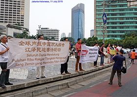 - 在印尼雅加达声援控告江泽民(图)- 七月十一日,法轮功学员在印尼首都雅加达举行活动,声援数万中国民众控告中共首恶江泽民,因其发动并指挥了对法轮功的残酷迫害。
