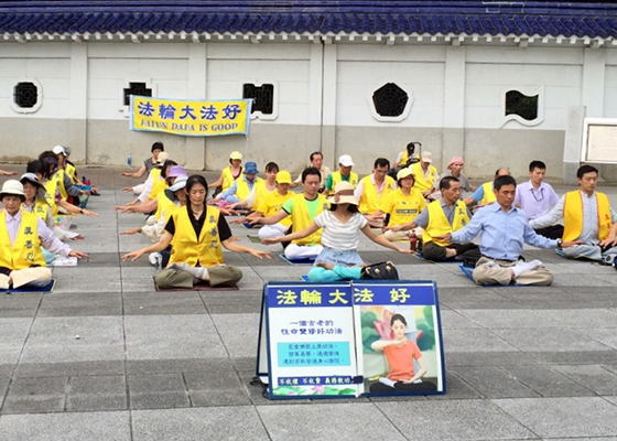 - 自由广场唤自由(图)- 七月十一日,在台北中正纪念堂自由广场上,游客往来穿梭,一群法轮功学员也来到这里炼功。