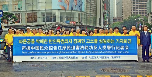 在当天的记者会上,社团法人韩国法轮大法佛学会发表声明,声明中表示,法轮功最初于一九九二年五月十三日从中国长春市开始传播开来后前七年里,约有1亿中国人通过修炼法轮功真正恢复了身心健康。但随着法轮功学员的急速增加,一九九九年七二十日,江泽民出于个人妒忌一意孤行开始残酷镇压法轮功,亲自建立一法外机构、镇压法轮功的专门组织 “610办公室”,并在全国范围内执行“名誉上搞臭,肉体上消灭,经济上截断”、“打死白打”、“打死算自杀、不查身源,直接火化”的迫害政策。江泽民还直接下令对法轮功学员施行活摘器官。迫害元凶江泽民触犯了中国《刑法》中的故意杀人罪、故意伤害罪、强摘出卖人体器官罪、非法拘禁罪、绑架罪、强迫劳动罪、侮辱诽谤罪、刑讯逼供罪、虐待被监管人罪,非法剥夺公民宗教信仰罪、渎职罪,以及中共政府一九八三年加入生效的“防止及惩治灭绝种族罪公约”及一九八八年批准生效的“禁止酷刑和其它残忍、不人道或有辱人格的待遇或处罚公约”中之“群体灭绝罪”和“酷刑罪”以及国际刑事法上最严重罪行“反人类罪”。