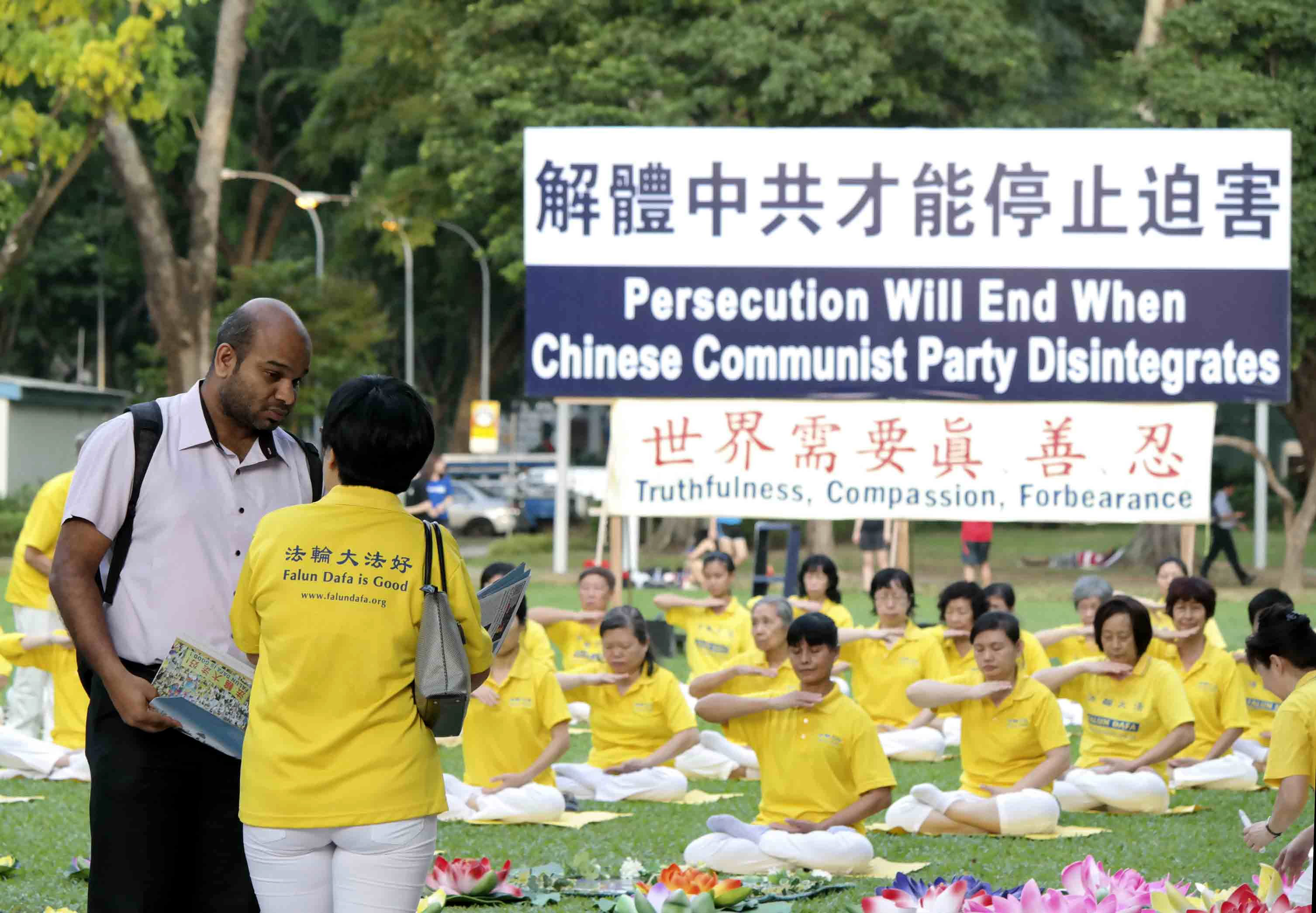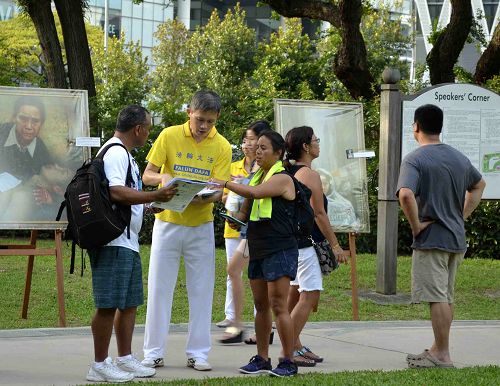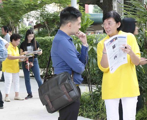 新加坡人李小姐在了解了迫害的情况后说:“坏人(迫害者)就是应该受到惩罚。”她还拿了资料,准备回去更多了解。 她最后祝福学员们好运。