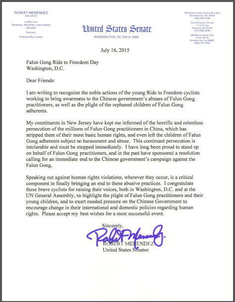 参议员罗伯特•梅南德斯(Robert Menendez)是参议院外交关系委员会的资深成员,也是前主席。他给青少年骑手们寄来支持信。信中说:“在中国对上百万法轮功学员的迫害剥夺了他们的基本人权,甚至使他们的孩子们遭到骚扰和虐待。这场迫害不可容忍,必须马上停止。一直以来,我为支持法轮功学员而骄傲。”