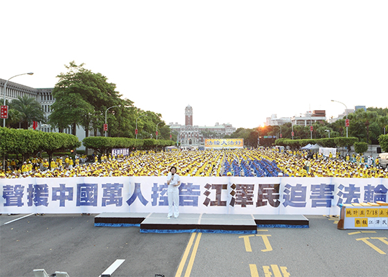 七月十八日晚间,来自台湾的五千名法轮功学员聚集在台北总统府前广场的凯达格兰大道集会,声援在中国和全球兴起的诉江大潮。