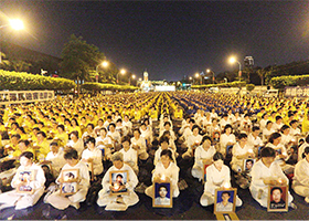 七月十七日傍晚,来自台湾五千多名法轮功学员在位于台北总统府前广场的凯达格兰大道举办烛光悼念。