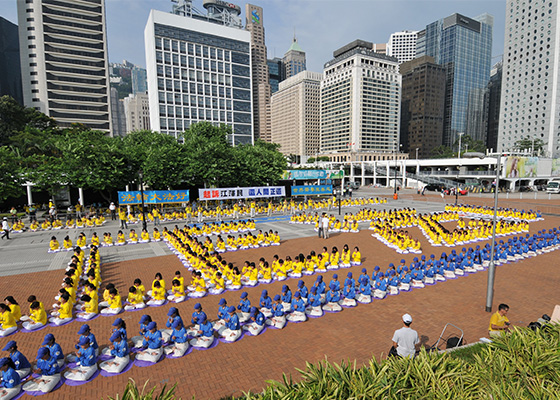 七月十九日,法轮功学员在香港中环爱丁堡广场排出“正法”二字并集体炼功。祥和的画面表达他十六年来秉持真善忍的精神。