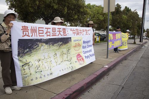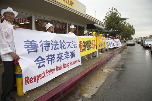 活动开始不久,下起了小雨,这是正在经历百年大旱的南加州半年来的第一场雨。学员们站立在雨中,继续拉着标语向民众传递着真相。他们用自己的亲身故事,告诉大家发生在中国十六年来的人权迫害,引起路人围观和关注。