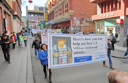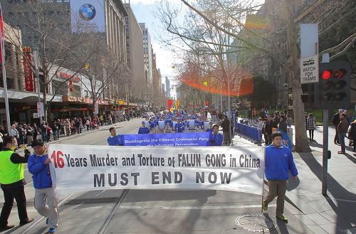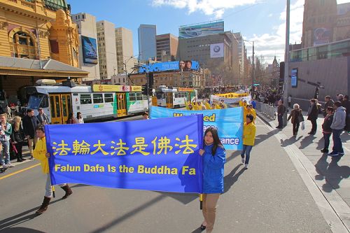 当天墨尔本一扫连日来的绵绵冬雨,湛蓝的天空、明媚的阳光下,法轮大法游行队伍绵延数百米,游行队伍途经市中心繁华的商业区及唐人街,最后到达终点站维多利亚花园(Victoria Park)。全程历经一个小时。