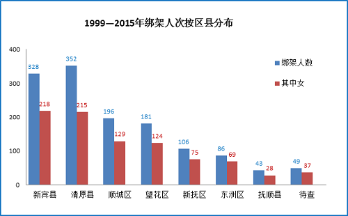 绑架迫害是抚顺市(四区三县)严重迫害形势之一,致使被绑架的法轮功学员迫害升级。其涉及范围之广,不分男女老少,不分何时何地,各个阶层只要有法轮功在就有绑架在,无处不及,其表现猖狂、凶狠、无人性。据明慧网不完全统计:(1999年7月~2015年5月)抚顺市法轮功学员遭绑架人数1341名(2063人次),其中女性895名,占67 %。见图所示: