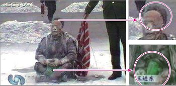 图为:自焚现场镜头。“塑料瓶子烧不坏”——王进东浑身烧黑,两腿间装汽油的塑料雪碧瓶在火中却不燃烧,不变形。脸被烧得臃肿,头发还完好无损。警察拎着灭火毯等待,直到王进东在镜头前喊完口号才把灭火毯盖到他身上。到底是自焚还是演戏?(推荐:可以到明慧网看现场录像慢镜头)
