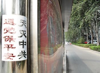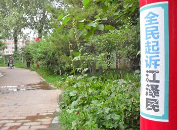 法轮功,把江泽民送上法庭”、“全民起诉江泽民”、“天灭中共,退党保平安”、“起诉江泽民,还人间正道“等。
