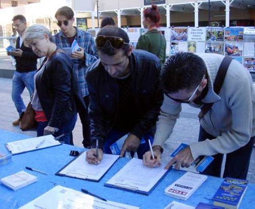 当天,在从上午十点至下午四点的活动期间,很多人在反活摘器官罪行的征签簿上签名,表达他们对法轮功的支持,谴责中共大规模活摘法轮功学员器官的暴行。