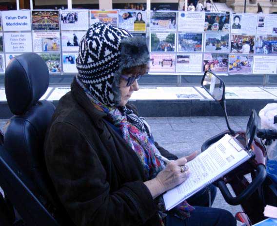 一位乘坐轮椅的老年妇人,了解真相后,一定要在反活摘征签簿上签名。她说:“这种罪行太恐怖了!一定要制止,必须马上制止。”